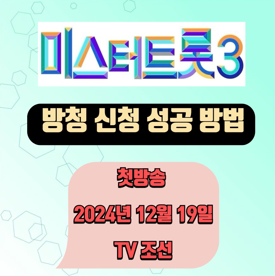 일본진출까지 보장된 미스터 트롯 시즌 3은 2024년 12월 19일 목요일 밤 10시 완전히 달라진 새로운 룰을 장착하고 여러분께 다가옵니다. 더욱더 까다로워진 심사를 거쳐 스타가 될 주인공은 누구